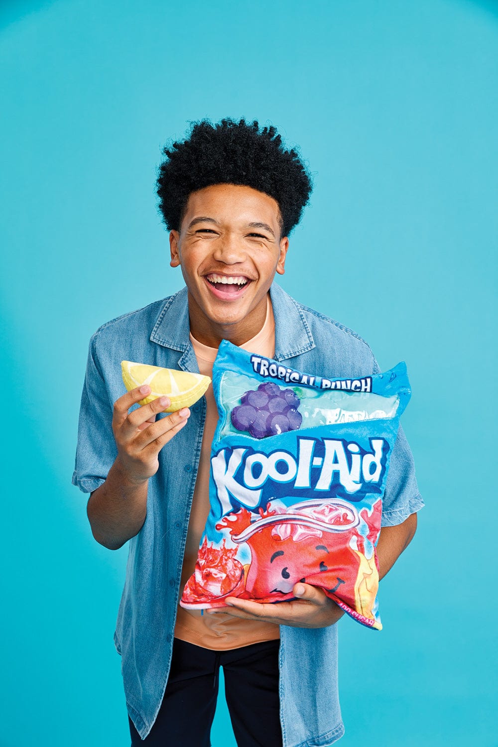 Unzip a sweet surprise with this oversized plush! The soft fleece bag looks like a tropical punch Kool-Aid package, featuring detailed illustrations and a see-through window in the front. The bag unzips to reveal 5 removable fruit plushies: lime, lemon, orange, grape, and cherry. Fun for teens, especially for summer sleepovers and making campsite tents extra cosy!