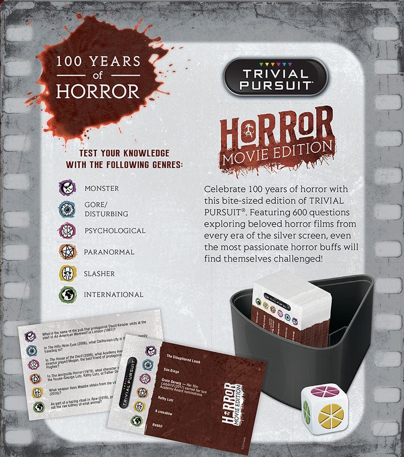 - 600 riveting questions about the following categories: Monster, Gore/disturbing/ psychological, paranormal, Slasher, and International